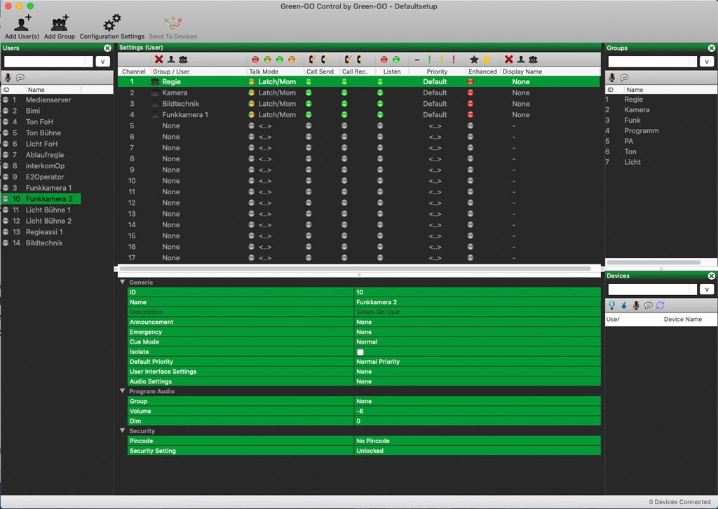 Wenn die brumm- und störgeräuschfreie Verbindung steht, kann gleichzeitig auf bis zu 32 Kanälen gesprochen werden, ohne sich gegenseitig zu stören. Einzelnen Usern, die eine übergeordnete Rolle haben (wie z._B. der Regisseur), kann eine hohe Priorität eingeräumt werden. In dieser Position kann der User andere Gespräche unterdrücken oder sogar ganz unterbrechen.