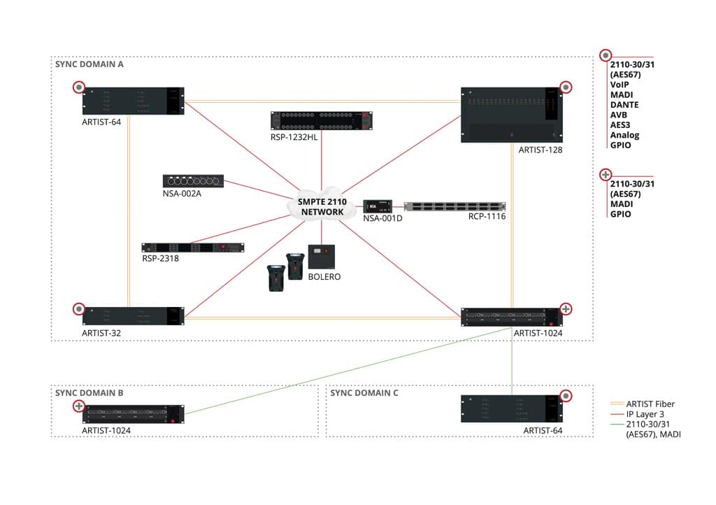 Die größte und modernste 1024er-Variante wird mit stromlos ablesbarem E-Ink-Display geliefert und ist durch ein Lizenzmodell auch von klein und günstig bis groß und fast grenzenlos zu skalieren. Nur die große Anzahl an physikalischen Buchsen war im nur 2 HE hohen Gerät nicht mehr unterzubringen und muss extern eingebunden werden. Oberstes Bestreben war es, das Intercom-Systeme in jegliche vorhandene Infrastruktur einbauen zu können und neben hoher Redundanz eine flexible Struktur zu schaffen. Durch den modularen Aufbau der Mainframes kann man das System mit fast allen erdenklichen Schnittstellen erweitern. So sind neben „altmodischen“ analogen Schnittstellen auch Dante, Madi, VoIP und alle SMPTE 2110-30 (AES 67) und -31 (AES 3) Karten erhältlich.