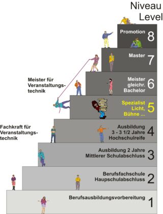 Die Folge daraus: ein Vakuum im Niveau 5. Das technisch/künstlerische Know-how des „alten“ Meisters wird mit dem „neuen“ Meister heute nicht mehr vermittelt. Es ist auch von der Fachkraft zur Veranstaltungstechnik aus dem Niveau 4 nicht zu erwarten. Weiterhin verändert sich die Technik rasant weiter, sodass man davon ausgeht, dass eine staatliche Ausbildungsform nicht die Dynamik erbringen kann, wie es die freie Wirtschaft leistet. So entstehen zurzeit von freien Bildungsträgern diverse Weiterbildungsangebote, die diese Lücke schließen wollen. Damit dieses Angebote auch untereinander bzw. für den Beauftragenden vergleichbar wird, ist hier ein Rahmenlehrplan notwendig, aus dem die Lehrinhalte sowie die dafür vorgesehenen Unterrichtseinheiten hervorgehen. Hier spielt der Spitzenverband der Veranstaltungswirtschaft, die IGVW, eine Schlüsselrolle und erarbeitet mit den angeschlossenen Verbänden entsprechende Rahmenpläne, die Standards der Qualität / Qualifikation.
