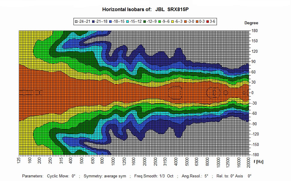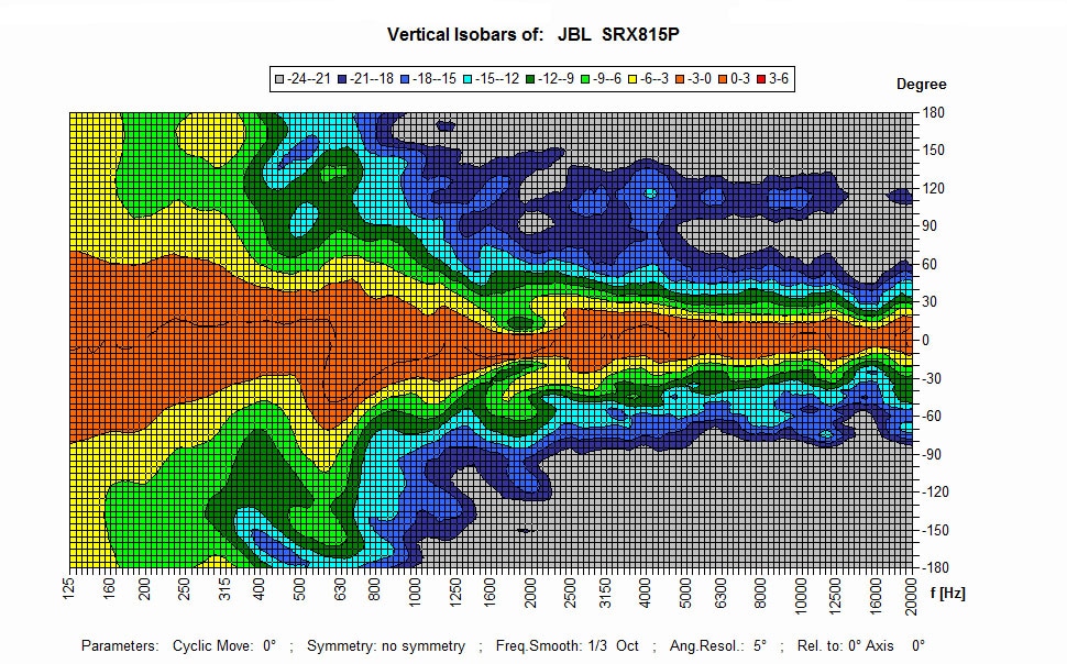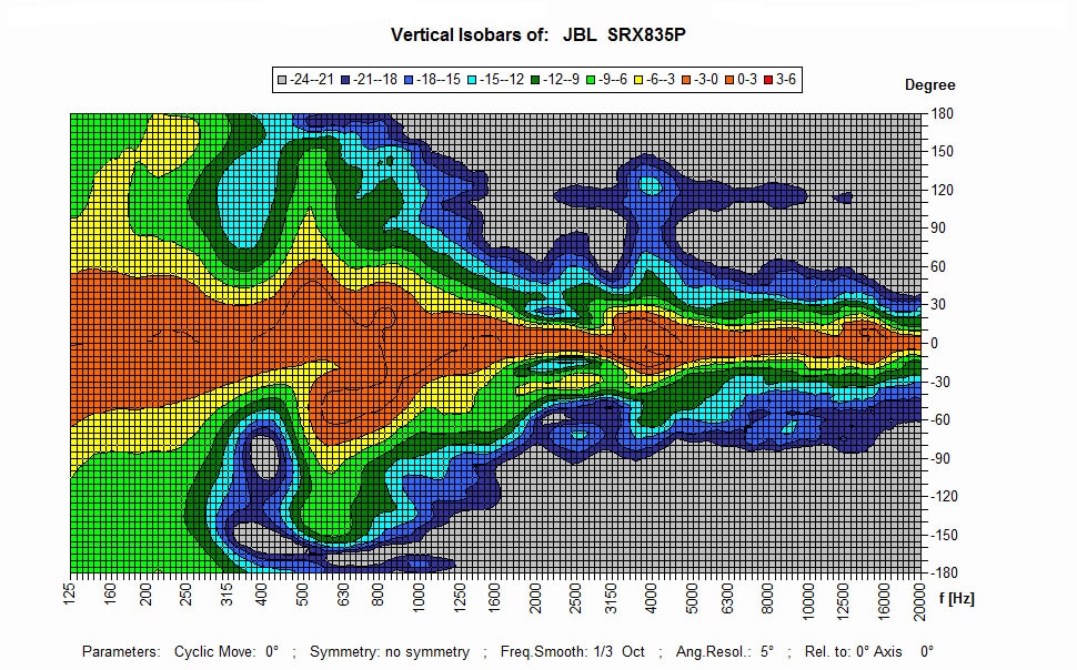 Für die SRX815P werden im Datenblatt als Abstrahlwinkel 90 × 50 Grad angegeben. Für das große Hochtonhorn sind diese Werte oberhalb von 2 kHz eine eher leichte Aufgabe. Der 15″er könnte dagegen schon seine Schwierigkeiten damit haben, da die große Membran die Abstrahlung der Mitten schon stärker bündelt. Eine Sprungstelle – zumindest in der Horizontalen – scheint somit schon fast unvermeidlich. Die Messungen überzeugen jedoch schnell vom Gegenteil. Die Isobarenkurve in Abb. 6 zeigen nur eine minimale Einschnürung um 2 kHz. Ansonsten ist der Verlauf sehr schön gleichmäßig, wenn auch eher mit 80 als mit 90 Grad zwischen den −6 dB Linien. Ähnlich gut und gleichmäßig geht die 3-Wege SRX835P in der horizontalen Ebene zu Werke. Der Öffnungswinkel beträgt hier exakt dem Datenblatt entsprechend 60 Grad.
