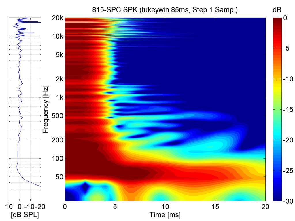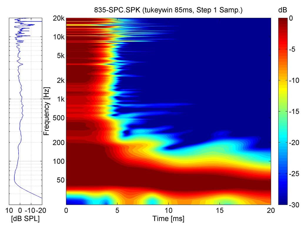 Spektrogramm der 2-Wege SRX815P mit einigen kleinen Resonanzen in den Mitten, oberhalb von 10 kHz entstehen Resonanzen durch Reflexionen am Hornmund und Gitter (Abb. 3)Spektrogramm der 3-Wege SRX835P – zwischen 300 Hz und 2 kHz sind deutlich weniger Resonanzen zu erkennen (Abb. 4)