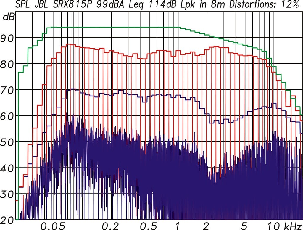 Betrachtet man dazu die Grafiken aus Abbildung 13 und 14 im Detail, dann fällt auf, dass der zusätzliche Mitteltöner auch hier der SRX835P einige Vorteile verschafft: Die blaue Kurve der Verzerrungsanteile liegt zwischen 300 Hz und 2 kHz deutlich niedriger. In der SRX815P muss der 15″-Tieftöner diesen Frequenzbereich übernehmen; die große Membranauslenkung durch die tieffrequenten Anteile verursacht dann entsprechende Intermodulationsverzerrungen. Überlässt man diesen Frequenzbereich dem Mitteltöner, dann gehen die Intermodulationsverzerrungen deutlich zurück.