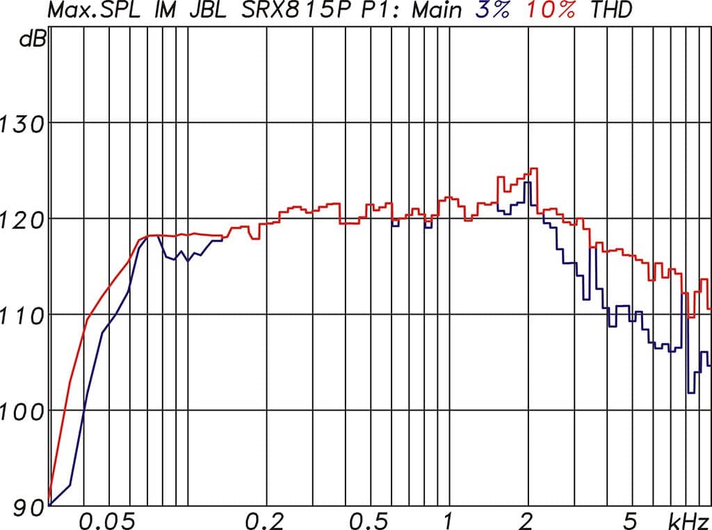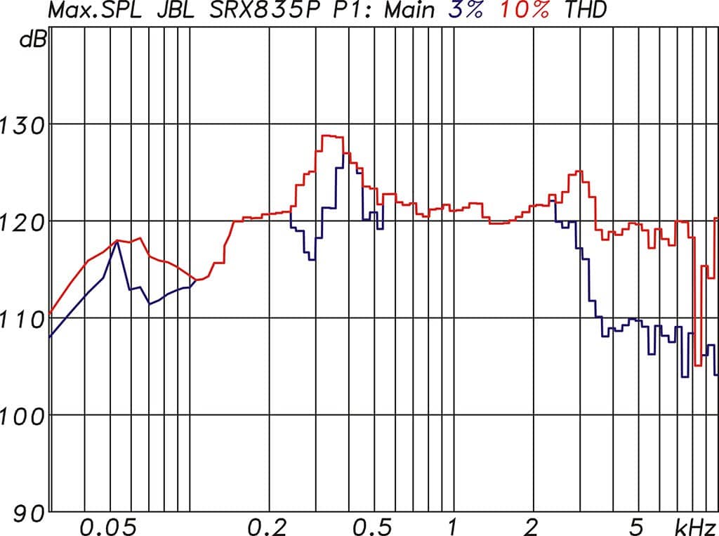 Maximalpegel SRX815P gemessen mit 185 ms Sinusbursts für maximal 3% (blau) und maximal 10% (rot) Verzerrungen (Abb. 10)Maximalpegel SRX835P gemessen mit 185 ms Sinusbursts für maximal 3% (blau) und maximal 10% (rot) Verzerrungen (Abb. 11)Maximalpegel Subwoofer SRX828SP gemessen mit 185 ms Sinusbursts für maximal 3% (blau) und maximal 10% (rot) Verzerrungen (Abb. 12)