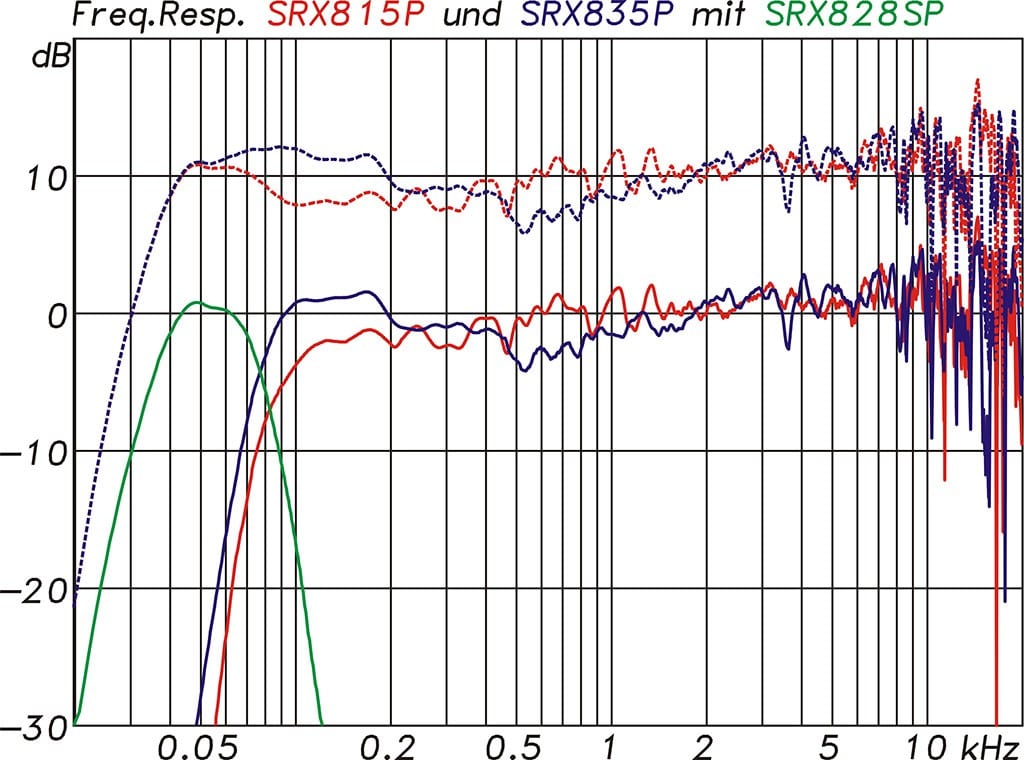 Sub-Frequenzgänge SRX815P (rot) und SRX835P (blau) im Zusammenspiel mit dem Subwoofer SRX828SP (grün), dessen Pegel sich anpassen lässt (Abb. 5)