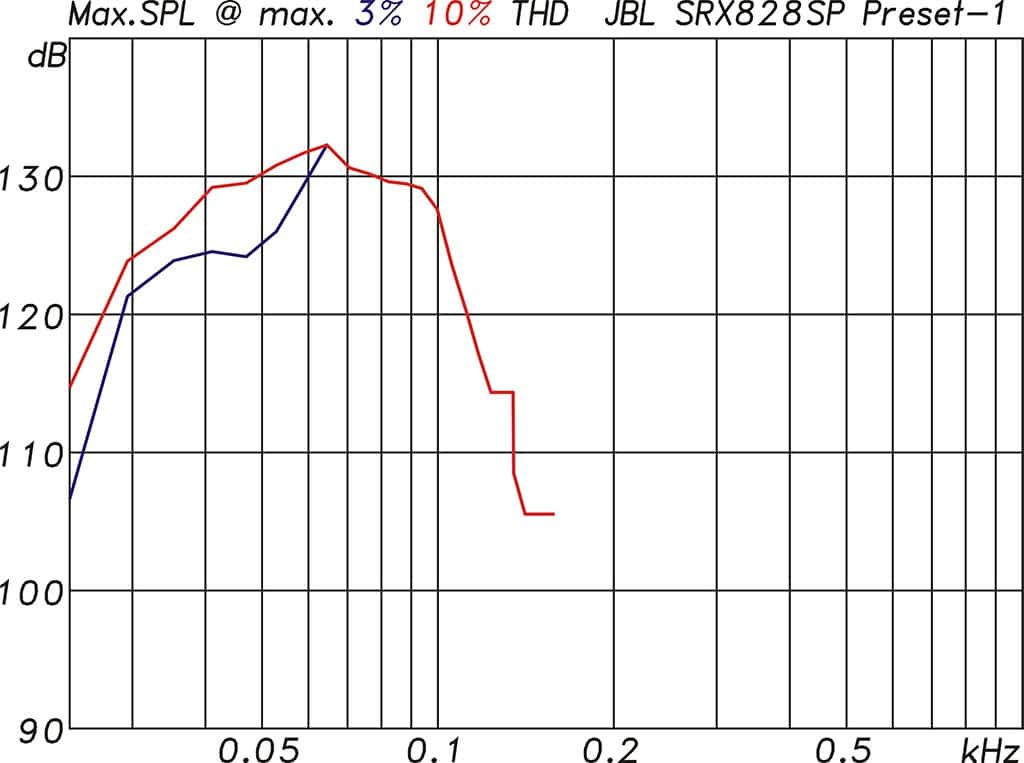 Die Sinusburst-Messung wurde auch noch mit dem Subwoofer SRX828SP durchgeführt, jedoch beschränkt auf den relevanten Frequenzbereich bis ca. 150 Hz. Mit 130 dB schon ab 40 Hz aufwärts zeigt der JBL-Subwoofer deutlich was in ihm steckt. Ein Subwoofer SRX828SP kann es so locker mit zwei Topteilen als Partner aufnehmen.