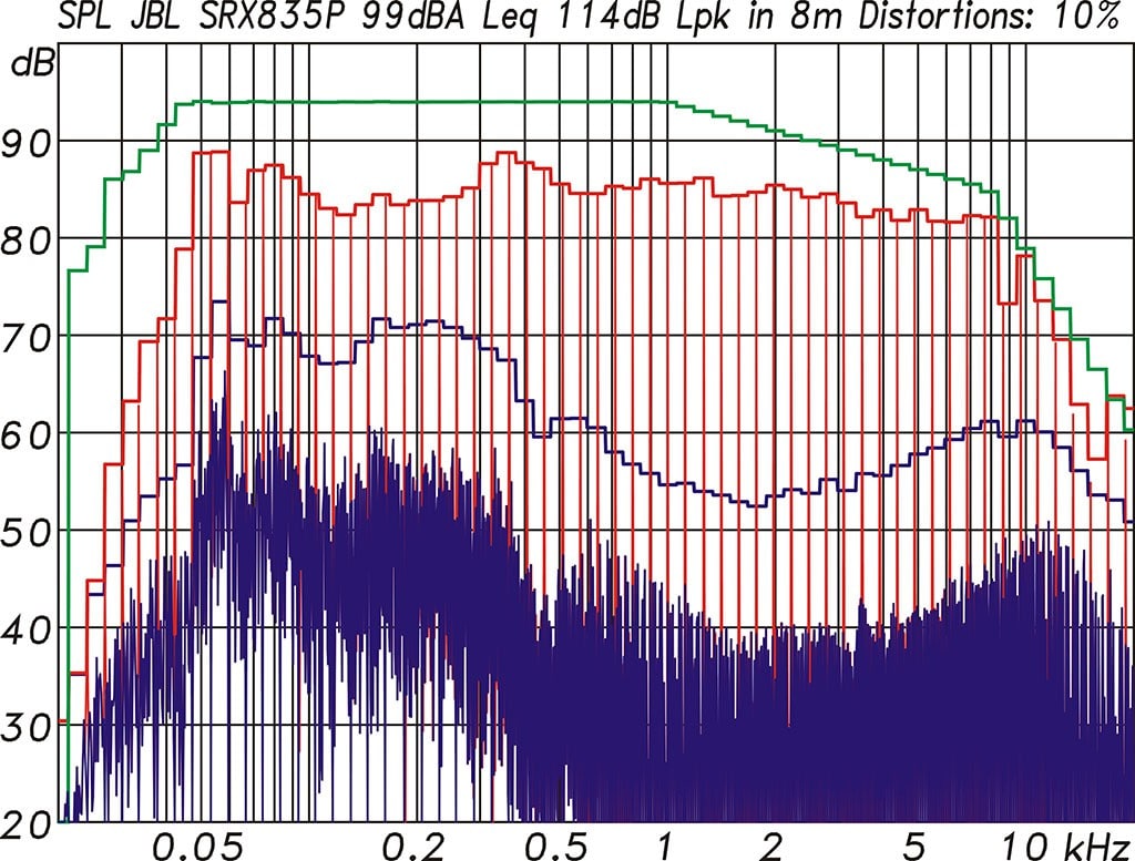 Für die zweite Messreihe zur Herausforderung der Maximalpegel wurden die Topteile SRX815P und SRX835P mit einem speziellen Multisinus Testsignal, das realer Musik sehr ähnlich ist, belastet. Schluss ist, wenn der Wert der Gesamtverzerrungen eine Größenordnung von ca. 10% erreicht. Diese Messung berücksichtigt neben den harmonischen Verzerrungen auch noch die besonders kritischen Intermodulationsverzerrungen. Die spektrale Verteilung des Signals entspricht einem mittleren Musiksignal nach EIAS426B mit einem Crestfaktor von praxisgerechten 12 dB.