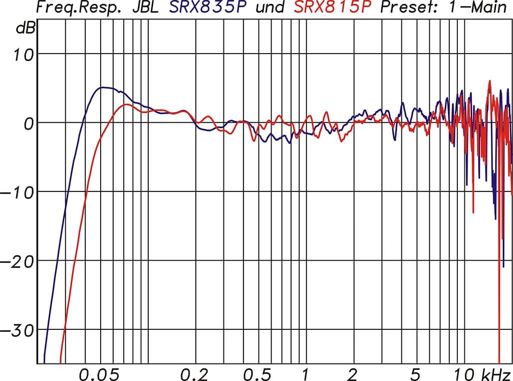 Für den Hörtest standen je ein Paar SRX815P und SRX835P sowie ein Subwoofer SRX828SP bereit. Gehört wurden die Topteile sowohl solo, wie auch in Kombination mit dem Subwoofer. Beide Topteile konnten auf Anhieb gefallen. Die SRX835P stellte sich dabei erwartungsgemäß größer und kräftiger auf, die SRX815P kam neutraler oder zurückhaltender daher. Die Frequenzgänge der beiden Tops erklären auch den Unterschied. Die „Badewanne“ im Verlauf über alles ist bei der SRX835P mit über 6 dB Tiefe viel ausgeprägter als bei der SRX815P, wo es kaum 3 dB sind. Genau das ist vermutlich auch so gewollt, dass die größere Box auch „größer klingt“. Wer das nicht möchte, weil es nicht immer passend ist, kann das natürlich leicht am integrierten parametrischen EQ korrigieren.