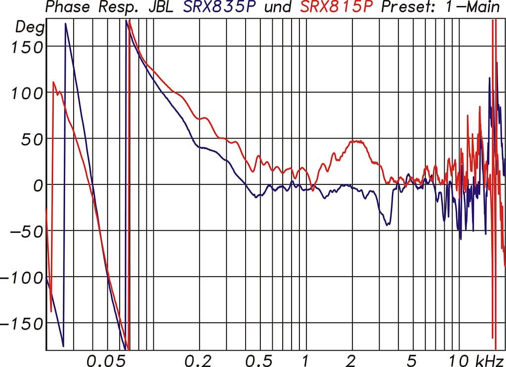Ein Vergleich der SRX815P und SRX835P erscheint unter diesen Aspekten somit interessant. Beginnt man mit den Frequenzgängen, dann liegen die Unterschiede primär in der Abstimmung: Die 835 reicht mit dem größeren Gehäuse etwas tiefer und wurde zudem auch noch etwas „kräftiger“ abgestimmt; mit einer leichten Mittensenke und ca. 5 dB Bassüberhöhung. Oberhalb von 10 kHz zeigen beide Lautsprecher eine deutliche Interferenzstruktur, die durch Reflexionen am Hornmund und am Gitter und auch durch Partialschwingungen der Membranen entstehen können. Die Phasengänge zeigen unabhängig vom Modell einen linearphasigen Verlauf ab ca. 400 Hz aufwärts, was ein klares Indiz für die Verwendung von FIR-Filtern ist, die zum einen die XOver-Funktion beinhalten und auch die beiden Wege komplex in der Amplitude und Phase entzerren. Bei der 835 gelingt das auch inklusive der nachfolgenden passiven Weiche zwischen Mittel- und Hochtöner. Die mit den FIR-Filtern zusammen einhergehende Gesamtlatenz liegt so bei 6 ms. Wechselt man die SRX815P auf das Monitor Setup (quer liegend kann sie als Wedge genutzt werden), dann wird die Latenz bewusst auf 2,6 ms verkürzt – ein wenig zu Lasten der linearen Phase.