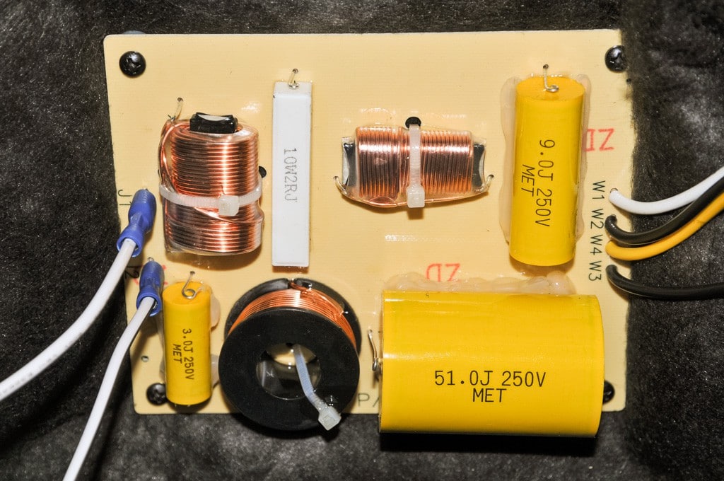 Folienkondensatoren sowie Luft- und I-Kern-Spulen: Passive Weiche in der SRX835P mit Hoch- und Tiefpassfiltern 3. Ordnung für die Trennung zwischen Hoch- und Mitteltöner (Bild: Anselm Goertz)