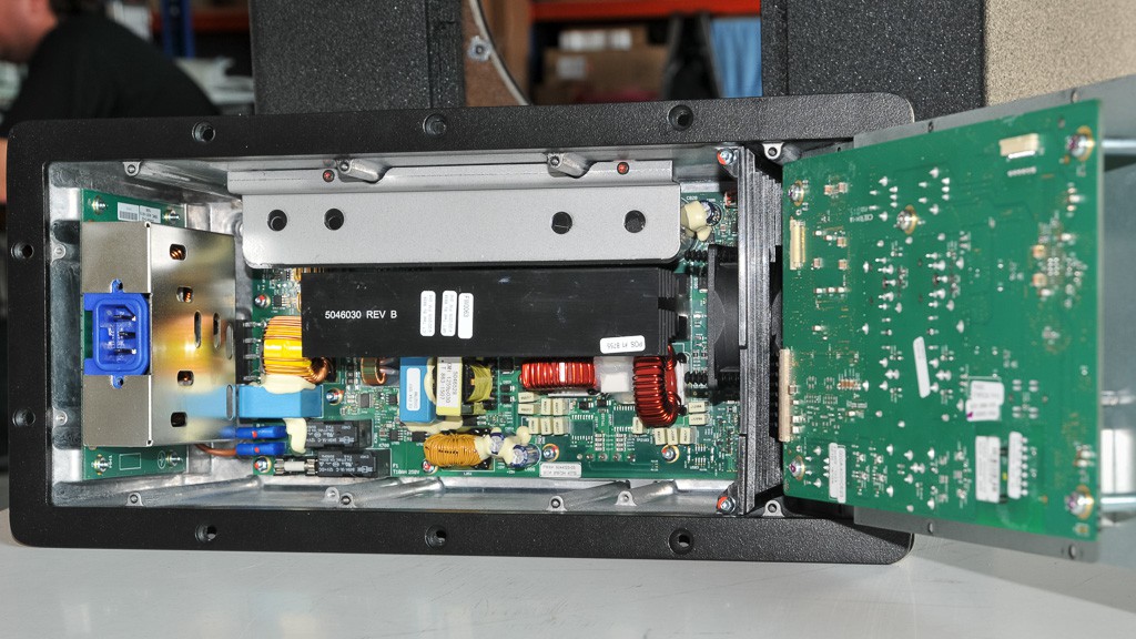 Die Elektronik ist als geschlossene Einheit auf den Rückseiten der Boxen eingelassen. Es besteht somit keine Verbindung zum Volumen des Lautsprechers, womit die Elektronik zumindest vor den heftigsten Vibrationen gut geschützt wird. Die Kühlung erfolgt über einen innen liegenden, leise laufenden Lüfter, der Luft von unten nach oben durch die Elektronik und das Kühlprofil zieht.