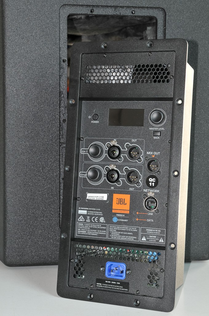 Im Angebot sind zurzeit drei Topteile und zwei Subwoofer: Die SRX812P und SRX815P als 2-Wege-Systeme basieren auf 12″- bzw. 15″-Tieftönern, die SRX835P als 3-Wege System auf einem 15″-Tieftöner. Bei den Subwoofern gibt es mit dem SRX818SP und dem SRX828SP die klassischen Modelle mit 1 × 18″ und 2 × 18″. Das „P“ am Ende der Typenbezeichnung steht für „powered“ und unterscheidet die fünf aktiven von den fünf vergleichbar bestückten passiven Systemen der SRX800 Serie, die zum Zeitpunkt des Erscheinens dieses Testberichtes Ende 2015 sukzessive auf den Markt kommen. Zum Test verfügbar hatten wir die Topteile SRX815P und 835P sowie den mächtige Subwoofer SRX828SP. Gemeinsam ist allen drei Lautsprechern das (bis auf den Mikrofonmischer) identische Elektronikmodul mit einem zweikanaligen Crown-Verstärker mit DriveCore-Technologie und DSPBearbeitung mit FIR-Filterung und LevelMax-Limiting. Beides sind übrigens auch die Kernmerkmale des JBL V5 Tunings, dazu passend heißt es in den SRX800-Datenblättern, dass die Lautsprecher kompatibel zum V5 Tuning seien.