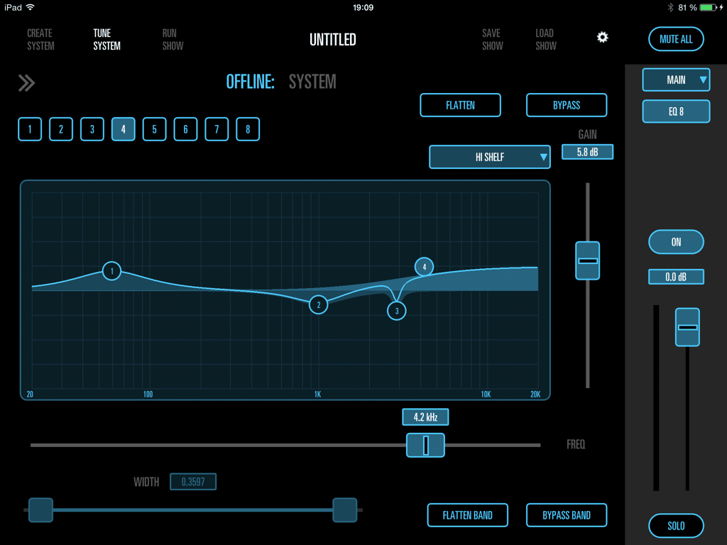Die Einstellmöglichkeiten der EQs hängen von der Gruppenzuordnung ab. Bei den Fills kann jeder Lautsprecher individuell und in der Gruppe gefiltert werden, bei den Hauptlautsprechern (Main L oder R) gibt es nur den Gruppen-EQ. Möglichen Fehlern durch unterschiedliche oder vergessene Einstellungen ist somit bereits in gewisser Weise vorgebeugt. In der „Tune System“-Einstellung gibt es zudem auch noch Signalgeneratoren mit Pinknoise, Whitenoise und Sinussignalen variabler Frequenz sowie eine sehr praktische Solo-Funktion. Diese verschwindet ebenso wie die Testtongeneratoren, wenn man von „Tune System“ auf „Run Show“ umschaltet. Immer verfügbar ist der Schalter „Mute All“, mit dem sich die Anlage komplett stummschalten lässt.