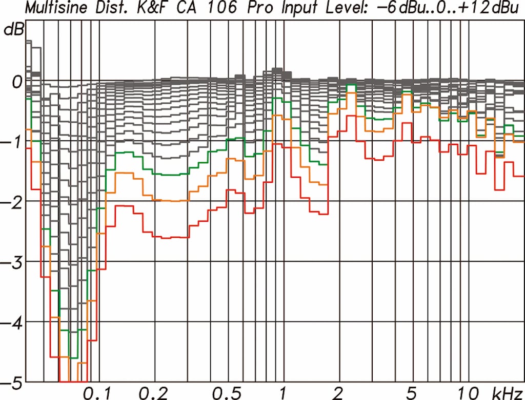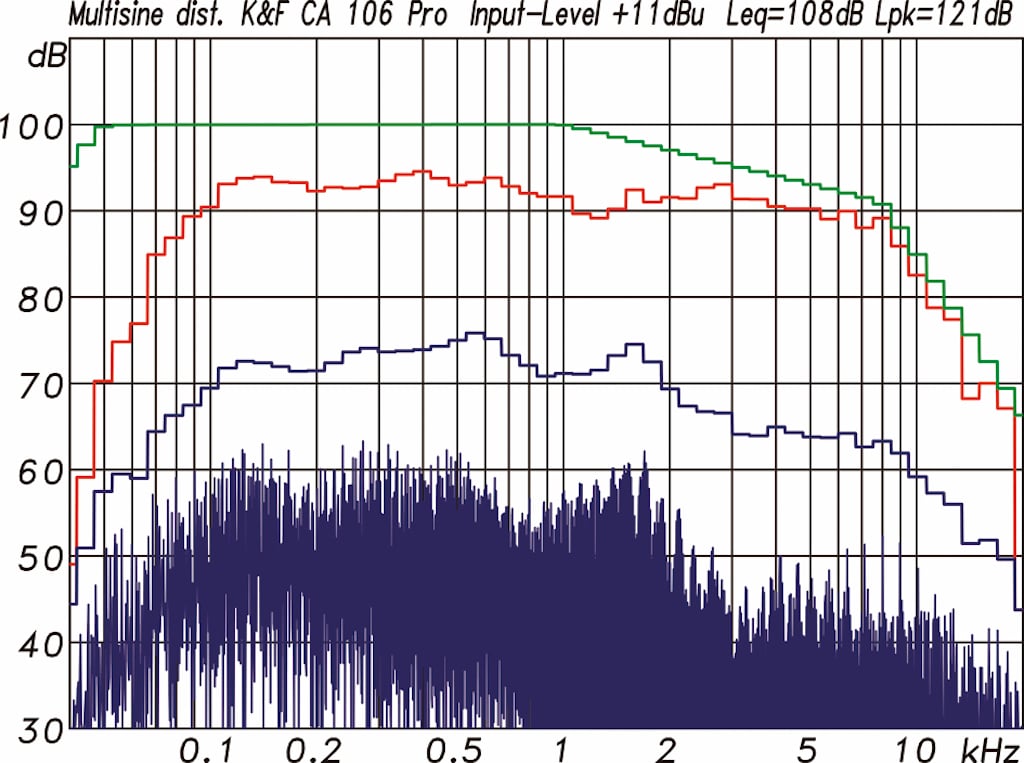 Verzerrungen einer CA 106 Pro mit einem Multitonsignal mit EIA426B Spektrum und 12 dB Crestfaktor für maximal 2 dB Power compression. Auf 1m im Freifeld bezogen wird dabei ein Pegel von 108 dB als Leq und von 121 dB als Lpk erreicht (Abb. 11) (Bild: Anselm Goertz)