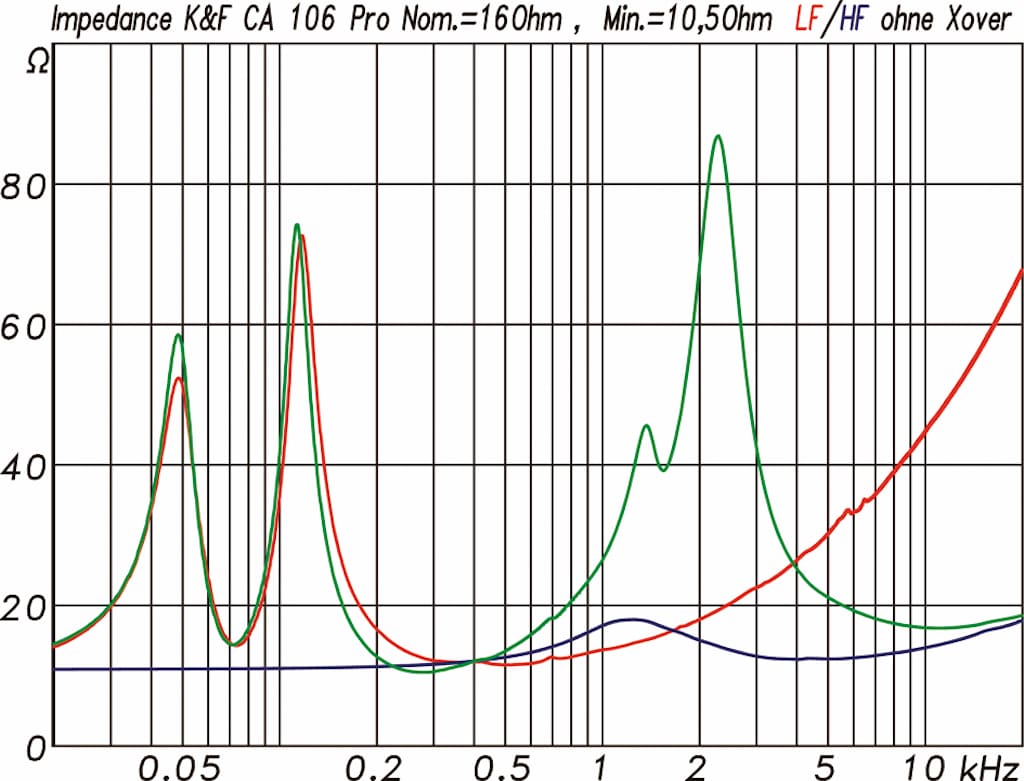 Impedanzkurven der CA 106 Pro: Einzelmessungen vom Tieftöner (rot) und Hochtöner (blau) ohne Weiche und von der Box insgesamt mit Weiche (grün), das Impedanzminimum der nominellen 16-Ω-Box liegt bei 10,5 Ω (Abb. 1) (Bild: Anselm Goertz)