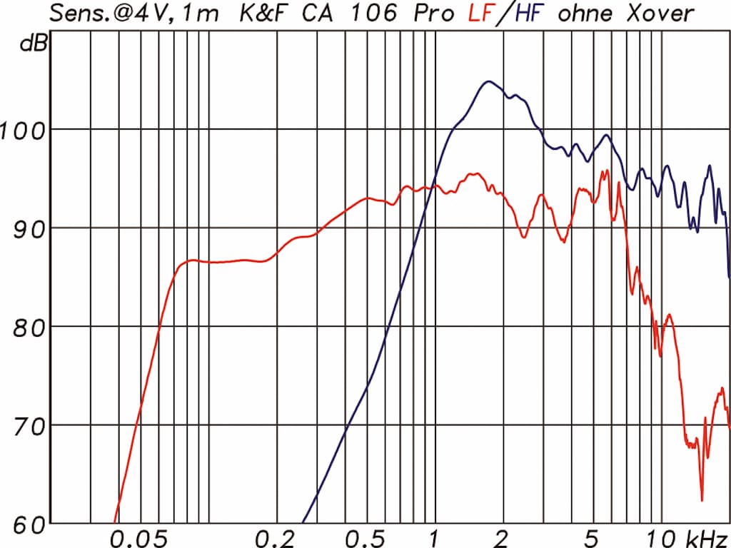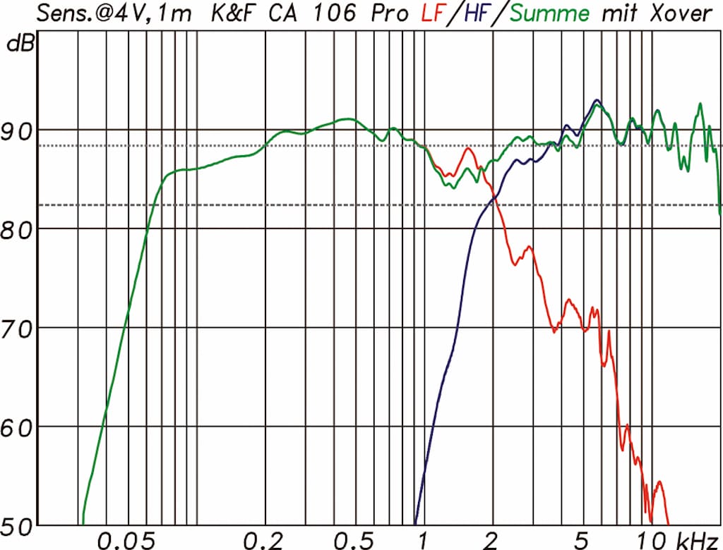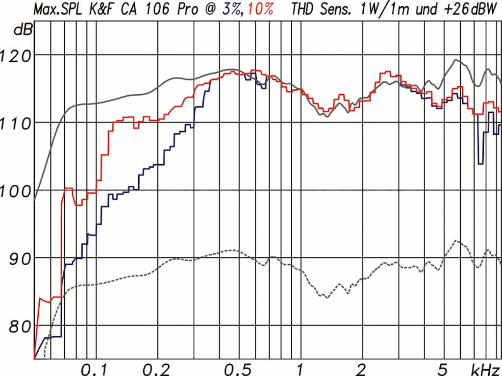 Nimmt man die Sensitivity-Kurve der CA 106 Pro und schiebt diese um 26 dB (entsprechend 400 W zu 1 W) nach oben, dann landet man recht genau bei dem gemessenen Verlauf des Maximalpegels. Zu tieferen Frequenzen hin unterhalb von 300 Hz driften die Kurven auseinander, da hier die durch die Membranauslenkung bedingten Verzerrungen beginnen zu dominieren und dann auch tatsächlich Verzerrungswerte von 10% THD erreicht werden.