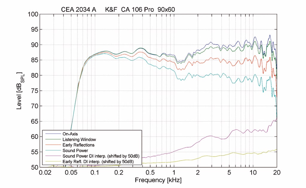 Der Frequenzgang des Listening Windows wird aus insgesamt neun Messungen gemittelt, die sich in dem Winkelbereich befinden, wo auch die Hörpositionen liegen. Die Early-Reflections-Mittelung berücksichtigt die Schallabstrahlung in Richtung der Flächen im Umfeld eines Lautsprecher, von denen frühe Reflexionen ausgehen könnten. Hier wird über insgesamt 26 Messungen gemittelt. Der Sound-Power-Frequenzgang entspricht dem Schallleistungspegel, den ein Lautsprecher insgesamt in den Raum abstrahlt. Die beiden unten noch eingefügten Kurven stellen die Differenz jeweils zwischen der Listening-Window-Kurve und der Sound-Power- (SPDI) bzw. Early-Reflections- Kurve (ERDI) dar.