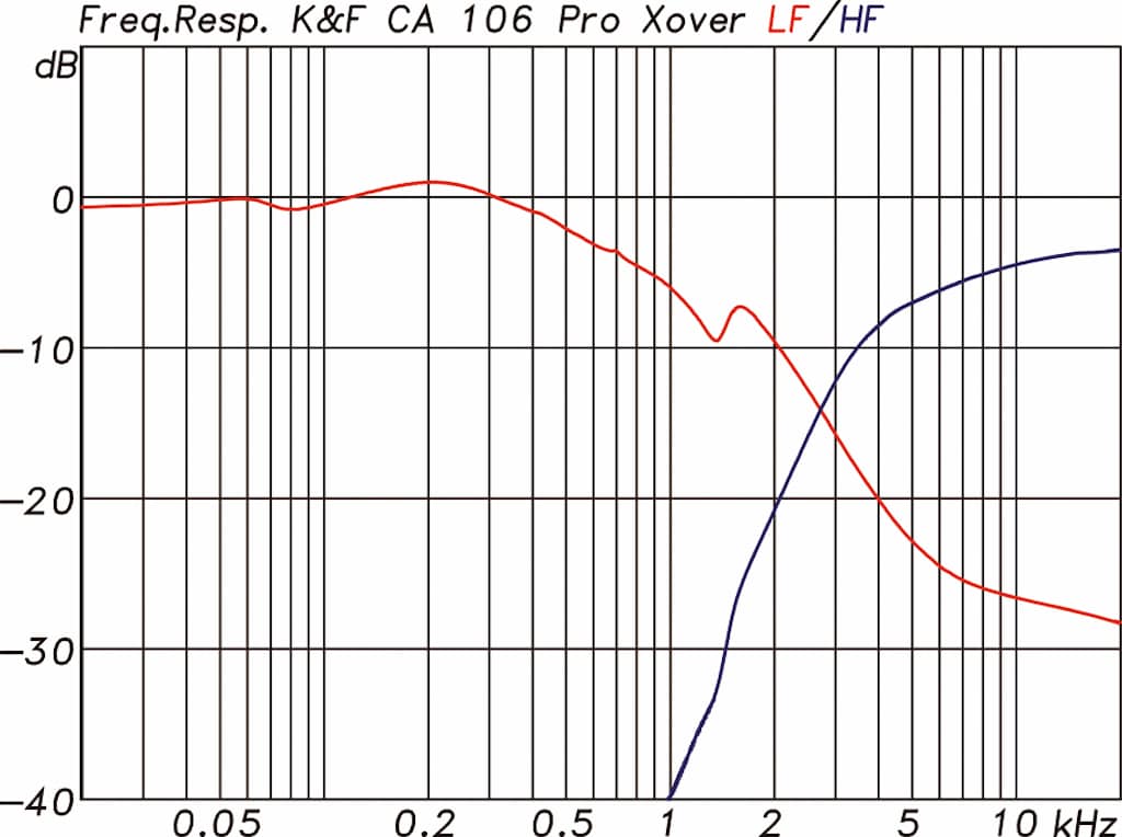 Die Übertragungsfunktionen der passiven Weiche finden sich in Abb. 3. Typisch für passive Filter spiegeln sich hier auch die Impedanzverläufe der Treiber wider. So wird die Tiefpassfunktion für den Tieftöner zu hohen Frequenzen hin durch den Impedanzanstieg des Treibers geschwächt. Im Falle der CA 106 Pro ist das unkritisch. Möchte man die Impedanzrückwirkung der Treiber jedoch vermeiden, dann kann das mit entsprechenden Bauteilen kompensiert werden, was die Weiche aber auch wieder größer und teurer macht.