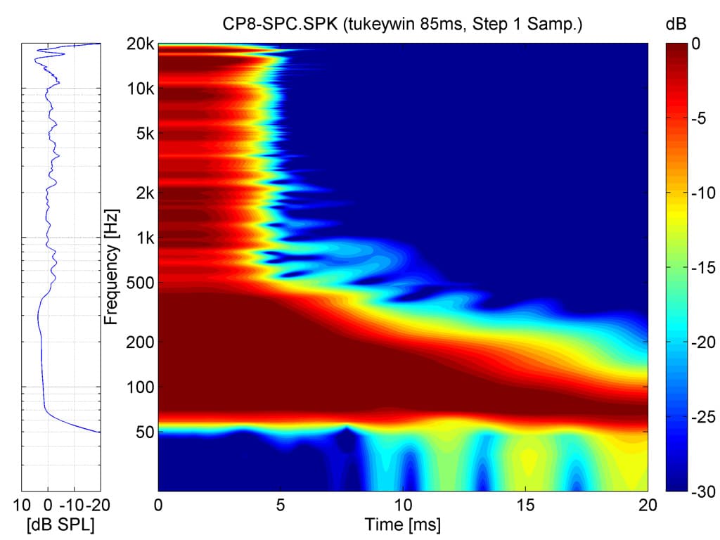 Im Spektrogramm aus Abb. 4 zeigt die CP8 ein insgesamt resonanzarmes Ausschwingverhalten. Auffällig ist lediglich das lange Nachschwingen bei tiefen Frequenzen. Die schon im Phasengang erkennbaren, ausgeprägten Phasendrehungen durch einen Allpassanteil in der Filterfunktion führen zu einem starken Anstieg der Gruppenlaufzeit bei tiefen Frequenzen und entsprechend zu einem langen Nachschwingen im Spektrogramm. Die nicht abgebildete Kurve der Gruppenlaufzeit weist bei 60 Hz ein Maximum von 32 ms auf. Die Phasendrehungen durch den Allpass sind ein Kompromiss, bei dem auf der anderen Seite die einfachere und flexiblere Anpassung zu den Subwoofern steht.