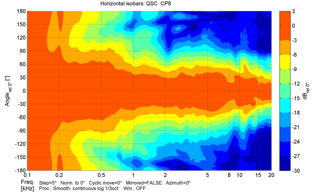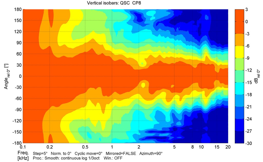 Directivity Matched Transition (DMT) nennt man bei QSC die Eigenschaft der Lautsprecher, in der Directivity keine Sprungstellen, Einschnürungen oder sonstige Unstetigkeiten zu erzeugen. Die CP-Serie ist dafür ein gutes Beispiel. Die CP8 arbeitet mit einem 90°-Hochtonsystem im Gegensatz zur CP12, die ein 75°-Horn besitzt. Bei gleicher Trennfrequenz bündelt der 12″-Tieftöner stärker als der 8″-Tieftöner und braucht daher für einen kontinuierlichen Übergang bei gleicher Trennfrequenz auch ein enger abstrahlendes Hochtonhorn. Wie gut der 8″-Tieftöner und der nominelle 90°-Hochtöner zusammenspielen, beweist die Isobarendarstellung aus Abb. 6. Die Trennfrequenz bei 2,2 kHz ist quasi nicht zu erkennen. Der mittlere Öffnungswinkel der Isobaren bei −6 dB (Übergang von orange auf gelb) liegt oberhalb von 1 kHz bei ca. 100° und fällt damit geringfügig breiter aus als der Datenblattwert von 90°.
