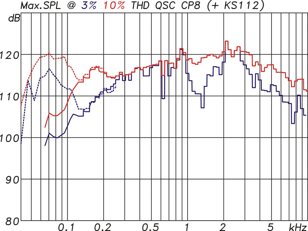 Für den Verzerrungswert werden alle Spektrallinien aufaddiert, die nicht im Anregungssignal vorhanden sind, d. h. die als harmonische Verzerrungen oder als Intermodulationsverzerrungen hinzugekommen sind. Auch bei dieser Art der Messung wird der Pegel so lange erhöht, bis der Gesamtverzerrungsanteil (TD = Total Distortions) einen Grenzwert von 10% (–20 dB) erreicht oder Limiter eine weitere Erhöhung des Pegels verhindern. Unter diesen Bedingungen erreichte die CP8 im Fullrange-Modus für ein typisches Musikspektrum nach EIA-426B bezogen auf 1 m Entfernung im Freifeld unter Vollraumbedingungen einen Spitzenpegel von 122 dB. Der Mittelungspegel lag bei 110 dB. Zusammen mit dem Subwoofer KS112 wurden 126 dB in der Spitze und 114 dB als Mittelungspegel erreicht. Das Datenblatt von QSC gibt dazu 124 dB für die CP8 und 126 dB für den KS112 an. Nähere Angaben zur Einstellung oder Kombination von Topteil und Subwoofer wurden dabei nicht gemacht. Die Messungen lassen die Werte jedoch plausibel und ehrlich erscheinen.