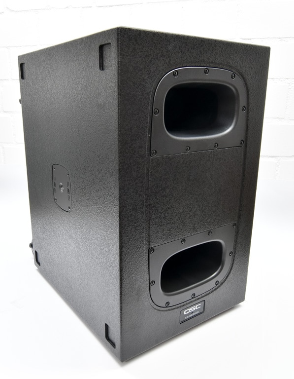 Subwoofer QSC KS112im Bandpassgehäuse mit zwei großen Ports für die Resonatoren, die mit ihrer Größe und den gerundeten Kanten die Strömungsgeräusche bei hohen Pegeln reduzieren (Bild: Anselm Goertz)