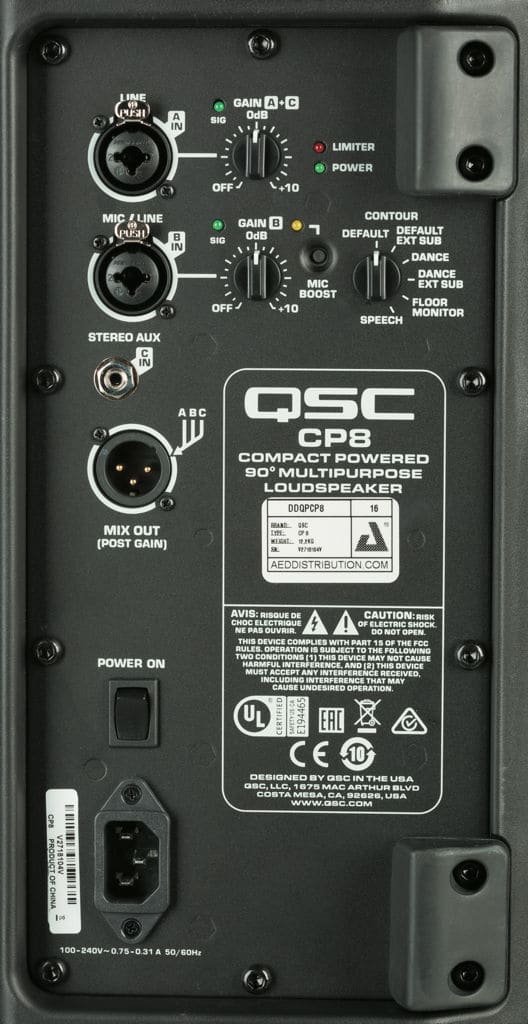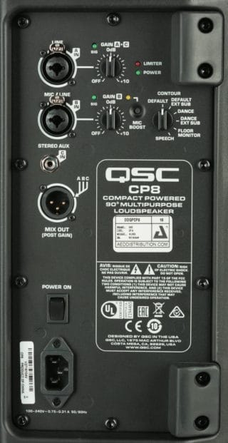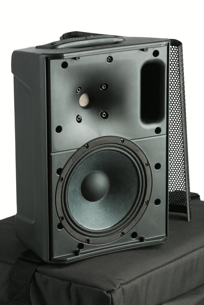 Die CP8 für sich betrachtet ist ein wirklich kompakter und leicht mit einer Hand zu handhabender QSC-Lautsprecher. Man mag es zunächst kaum glauben, dass man hier eine komplette voll aktive 2-Wege-Box mit 8″-Tieftöner in der Hand hat. Die angenehme Gehäuseform mit gerundeten Kanten sorgt zudem dafür, dass sich der Lautsprecher auch gut verpacken lässt. Schraubt man das solide Frontgitter ab, dann kommen die beiden Treiber und eine großzügig dimensionierte Bassreflexöffnung zum Vorschein. Letzteres ist vor allem wichtig, wenn es um die Vermeidung von Strömungsgeräuschen am Tunnel geht. Für den Hochtöner gibt es ein in die Front integriertes kleines Horn.