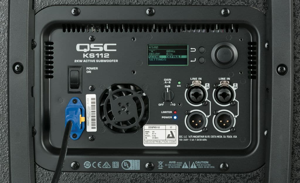 Das Elektronikmodul mit einer Class-D-Endstufe von 2 kW ist auf der Rückseite eingebaut. Durch eine tiefe Metallschale und zusätzliche seitliche Gleitschienen sind Anschlüsse, Display und Bedienelemente beim Transport gut geschützt. Das Modul verfügt über zwei Eingänge mit direkten Link-Ausgängen. Die Signale der beiden Eingänge werden intern summiert, so dass der KS112 auch als Mono-Subwoofer eingesetzt werden kann. Über das Display mit zwei Tasten und einem Drehgeber können diverse Parameter wie Trennfrequenz, Delay und Setups eingestellt werden. Hochpassgefilterte Ausgänge bietet der KS112 nicht. Die Signale werden ungefiltert zu den Topteilen weitergeleitet, die dann selber über die passende Filterung verfügen. Welche Trennfrequenz-Einstellung mit 80 oder 100 Hz passend für die Topteile von QSC ist, kann dem Manual entnommen werden. Für die CP8 wird die Einstellung 80 Hz genutzt.