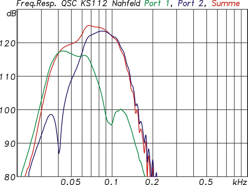Der zu dem Pärchen CP8 mitgelieferte QSC-Subwoofer KS112 ist als Zweikammer-Bandpass konstruiert: Der Treiber arbeitet mit der Membranvorderseite und Rückseite jeweils auf einen Resonator. Die Resonatoren strahlen dann den Schall über die beiden Öffnungen auf der Frontseite ab. Durch eine entsprechende Abstimmung der beiden Resonatoren entsteht in der Summe der Bandpassfrequenzgang. Abb. 5 zeigt dazu die Nahfeldmessungen an den beiden Öffnungen und deren Summenfunktion. Die Messungen erfolgten über den internen DSP mit dem Setup für 100 Hz Trennfrequenz. Ohne diese zusätzliche elektrische Filterung wäre der Tiefpassverlauf oberhalb von 100 Hz nicht so perfekt.