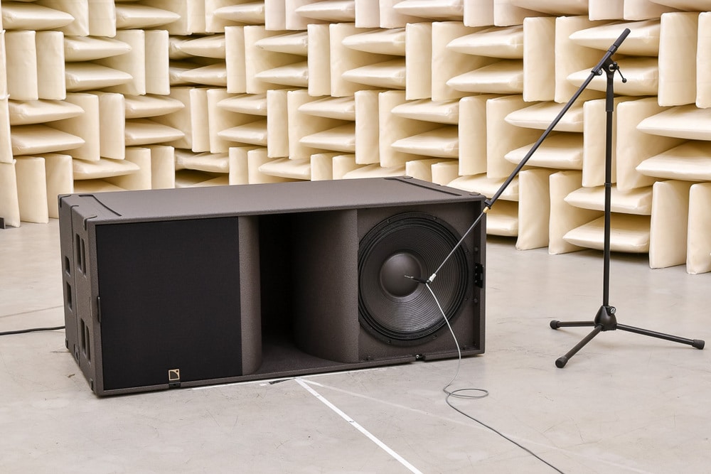 Wie misst man einen Subwoofer eigentlich? Erst einmal, wie auch alle anderen Lautsprecher, in einem reflexionsarmen Umfeld. Der klassische reflexionsarme Raum stößt dabei jedoch mit seiner eigenen unteren Grenzfrequenz mehr oder weniger früh an seine Grenzen: Eine hinreichende Absorption liefern die porösen Keile an Decken und Wänden nur bis zur der Wellenlänge, bei der mindestens noch ein Viertel der Wellenlänge komplett in den Absorber eindringen kann. Sind die Keile – wie in unserem Messlabor – 80 cm lang, dann wird diese Voraussetzung bis knapp zu 100 Hz hinab erfüllt.