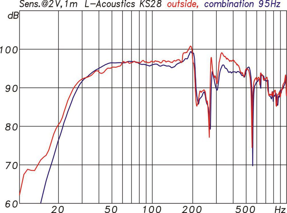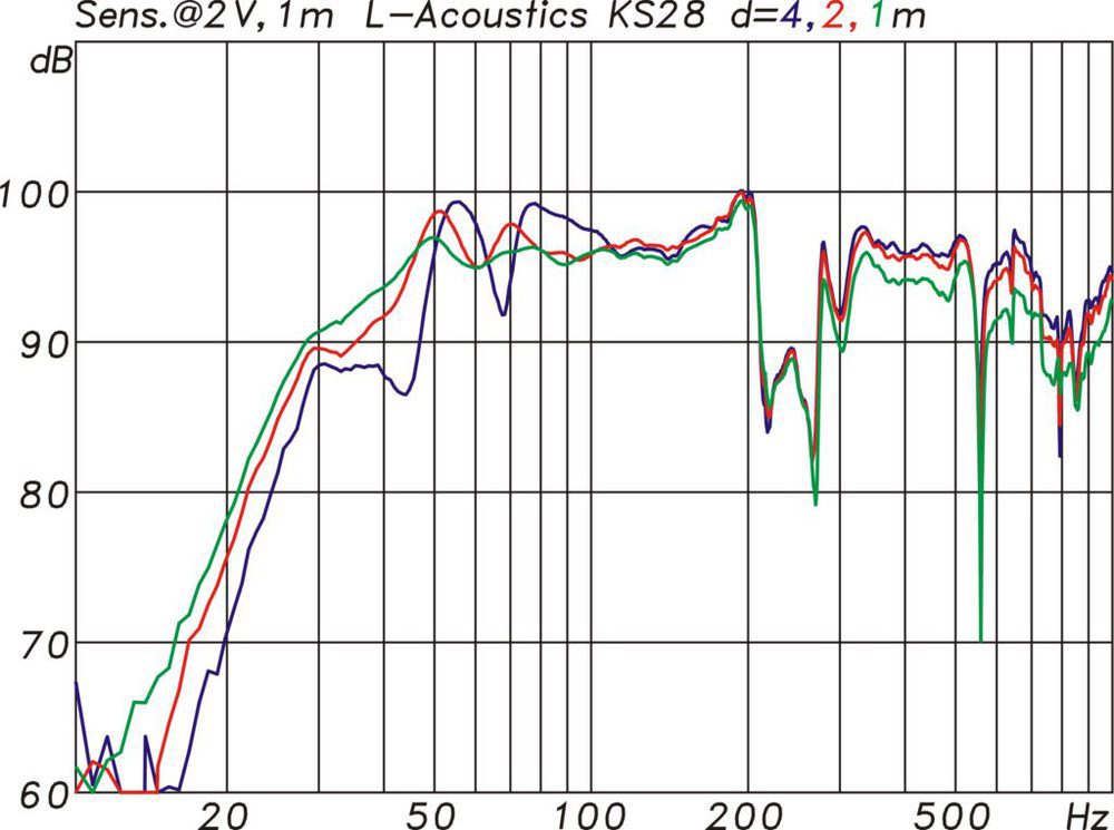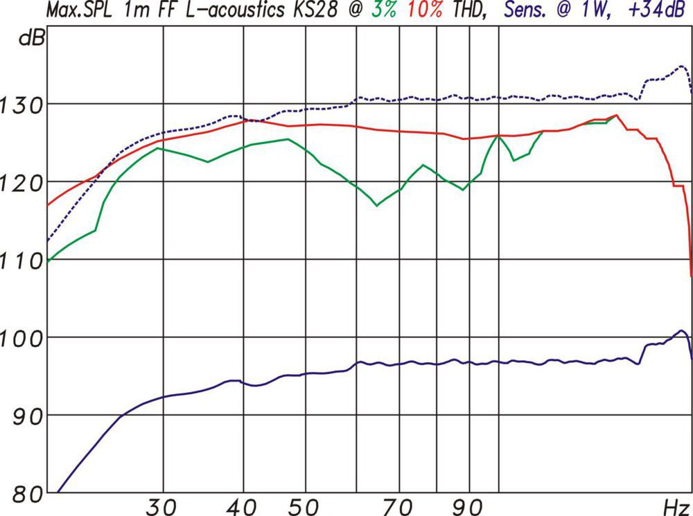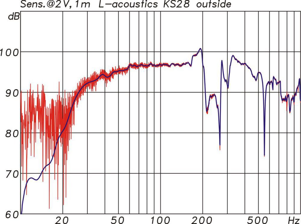 Der Frequenzgang aus Abb. 2 liefert eine mittlere Sensitivity zwischen 30 und 100 Hz von 95,3 dB. Ab 60 Hz aufwärts sind es dann 97 dB. Theoretisch einsetzbar wäre der KS28 bis knapp unter 200 Hz, wo die ersten Gehäuseresonanzen auftreten und für Unruhe im Frequenzgang sorgen. In den L-Acoustics-Setups liegt die höchste Trennfrequenz zu den Topteilen ohnehin bei 100 Hz. Probleme durch die Gehäuseresonanzen sind somit nicht zu erwarten.