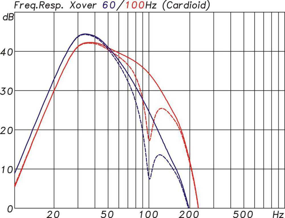 Die Filterfunktionen für den KS28 finden sich in Abb. 7 für Trennfrequenzen von 60 Hz und 100 Hz. Im Cardioid-Modus arbeiten drei der vier Verstärkerkanäle unverändert und der vierte Weg wird über ein Delay und ein 100 Hz Notchfilter für den rückwärtigen Lautsprecher bereitgestellt. Entsprechend ist dann auch das Verhältnis der Lautsprecher im CardioidModus 3 : 1.