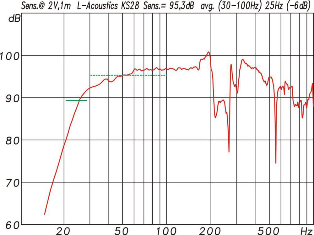 Frequenzgang der KS28 mit Sensitivity bezogen auf 2 V / 1 m. Gemittelt von 30 bis 100 Hz beträgt die Sensitivity 95,3 dB. Darauf bezogen liegt die untere Eckfrequenz (–6 dB) bei 25 Hz. (Abb. 2) (Bild: Anselm Goertz)