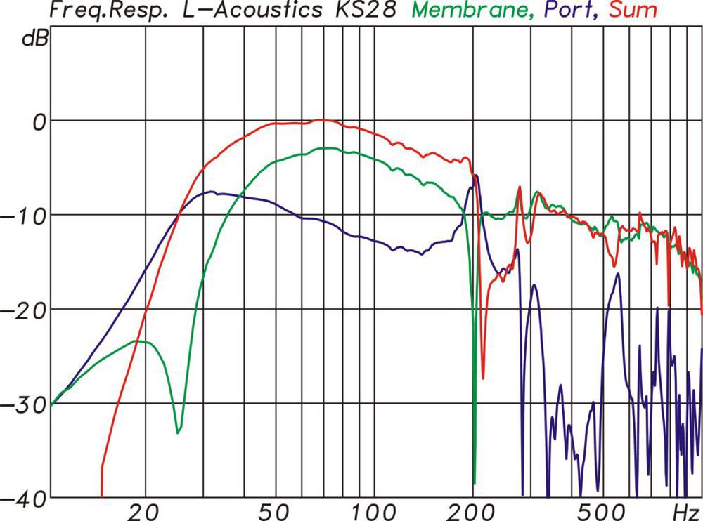 Eine bekannte und praktikable Lösung besteht daher in der Kombination mit einer Nahfeldmessung für den Frequenzbereich unterhalb von 100 Hz. Abb. 4 zeigt dazu die Messungen im Nahfeld von Membran und Tunnel der KS28. Im Nahfeld nur wenige Millimeter vor der Schall abstrahlenden Membran oder Port-Fläche ist der Direktschallanteil so überwiegend, dass Reflexionen von entfernten Wänden keine Bedeutung mehr haben. Bevor die Kurven von Membran und Port komplex addiert werden, werden diese zunächst am unteren Ende des Frequenzbereiches gleich gesetzt. Der Hintergrund für diese Regel ist der bei sehr tiefen Frequenzen weiter unterhalb der Tuningfrequenz gleiche Volumenfluss durch die Membran(en) und den Tunnel.