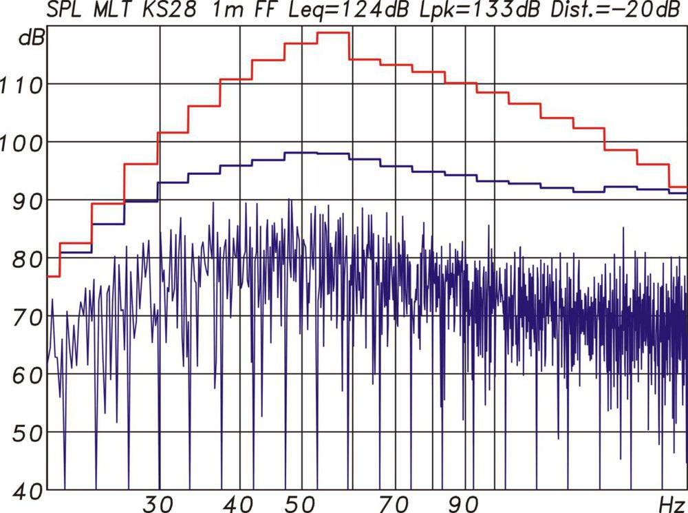 Neben der 10 %-THDGrenze ist der Einsatz eines Limiters ein weiteres Abbruchkriterium für die Messreihe. Die blauen Kurven in Abb. 12 zeigen die Sensitivity der KS28 und den daraus zusammen mit der maximalen Verstärkerleistung von 2,6 kW (+34 dBW) berechneten Maximalpegel. Der rechnerische Wert für den Maximalpegel wird nahezu erreicht. Unterhalb von 50 Hz sind die rechnerischen und gemessenen Kurven sogar nahezu deckungsgleich. In diesem Frequenzbereich wird der Treiber kräftig vom Bassreflexresonator unterstützt. Die Membranauslenkung ist entsprechend gering und somit auch die Verzerrung. Oberhalb von 50 Hz wird dem Treiber selber mehr abverlangt, wo dann die auslenkungsbedingten Verzerrungen oder auch der Auslenkungslimiter beginnen eine Rolle zu spielen. Insgesamt liefert die KS28 damit ein sehr gutes Ergebnis, das sich nahe am rechnerisch möglichen Maximum bewegt. Mehr kann man nicht verlangen.