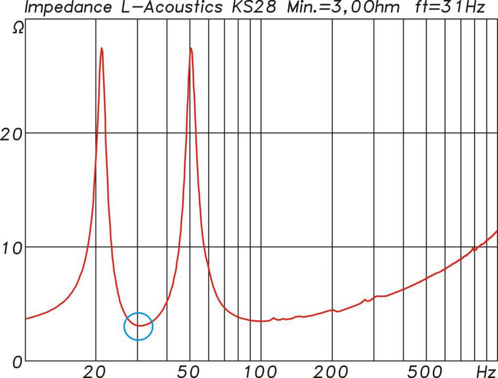 Einen ersten messtechnischen Eindruck der KS28 liefert die elektrische Impedanzmessung. Abb. 1 zeigt die Kurve einer klassischen Bassreflexabstimmung nach Lehrbuch. Die Abstimmfrequenz liegt ganz knapp oberhalb von 30 Hz, zu erkennen am Impedanzminimum zwischen den beiden Maxima. Die Kurve fällt hier bis auf 3,0 Ohm. Da die zugehörige Endstufe LA12X bis zu 2,7 Ohm Nennimpedanz hinab spezi- fiziert ist, stellt das 3-Ohm-Minimum der KS28 kein Problem dar.