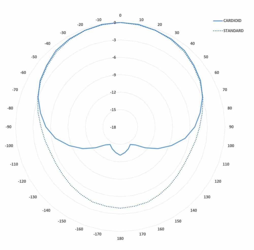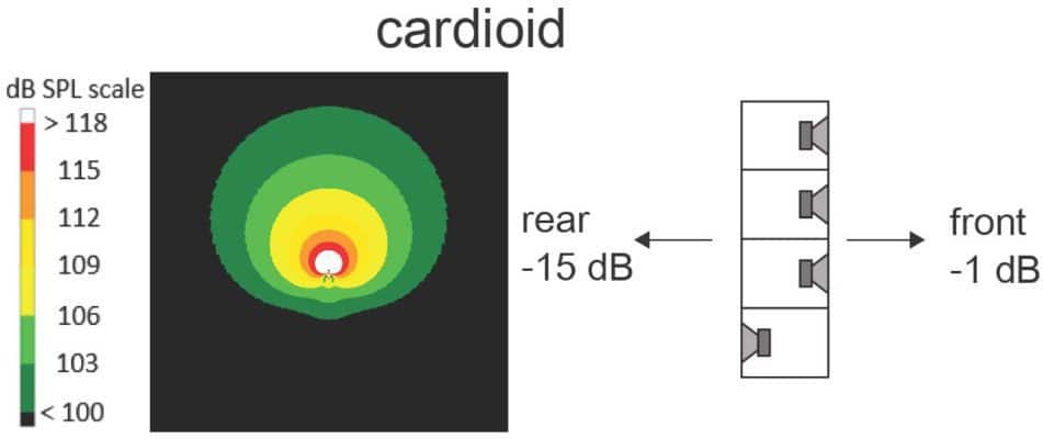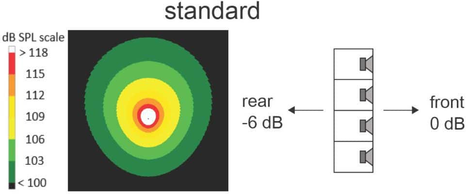 L-Acoustics vertritt für Cardioid-Anordnungen den Ansatz, primär mit möglichst wenig Pegelverlust auf der Frontseite eine soweit wie mögliche Verbesserung der Rückwärtsdämpfung zu erzielen. Ein Cardioid-Stack besteht dabei immer aus drei Frontsystemen und einem „gedrehten“ System. Abb. 14 zeigt das Richtverhalten eines Standard-Stacks aus vier Boxen im Vergleich zur Cardioid-Anordnung. Auch das Standard-Stack erreicht eine schon um 6 dB reduzierte Abstrahlung nach hinten, da es schon durch die Größe des Aufbaus und der Frontfläche als solches zu einem gewissen Richtverhalten im Vergleich zu einem einzelnen kleinen Subwoofer kommt.