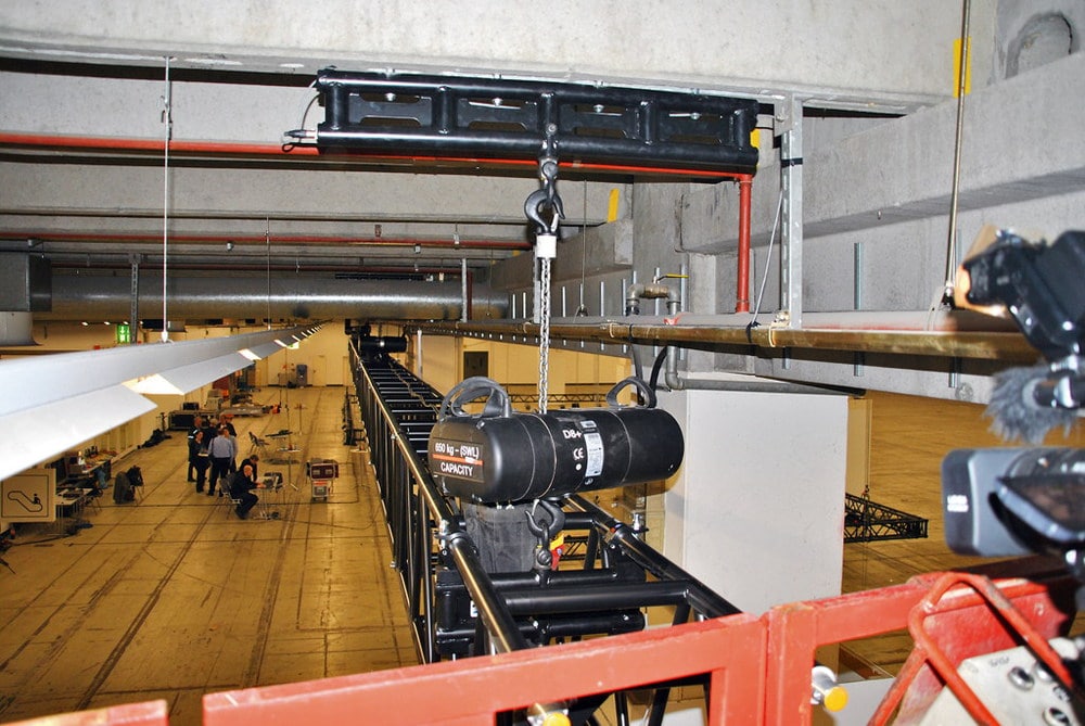 Viele Mehrzweck- wie Messehallen haben eingelassene Halfenschienen zur Lastaufnahme. Das ist aus Sicht des Architekten die beste Möglichkeit ein Gebäude so universell wie möglich auszustatten, denn meist sind zu diesem Zeitpunkt die anschließende Anforderung und deren optimal benötigter Befestigungstyp nicht vorauszusehen. Wenn man dann doch mal an Stellen größere Punktlasten benötigt als die Halfenschiene bereitstellt, muss man sich anders behelfen. Bisher wurden mehrere Punkte zu einem gemeinsamen Lastpunkt zusammengeführt.