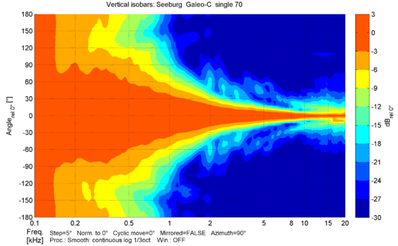 In einer ersten Messreihe wurden die Isobarendiagramme für die beiden Varianten des Galeo C für eine einzelne Box horizontal und vertikal gemessen. In der Vertikalen verhalten sich beide Galeos weitgehend identisch. Abgebildet ist daher stellvertretend in Abb. 11 nur die 70°-Version. Wie sich die jeweiligen Waveguides in der Horizontalen auswirken, zeigen die Isobarendiagramme in Abb. 9 und 10. Beide Modelle halten ihren nominellen Winkel von 70° bzw. 100° sehr gut ein. Erreicht wird das nominelle Abstrahlverhalten bereits ab ca. 500 Hz. Lediglich die 70°-Version weicht durch eine Aufweitung der Isobaren bei 15 kHz etwas vom Nennwert ab.