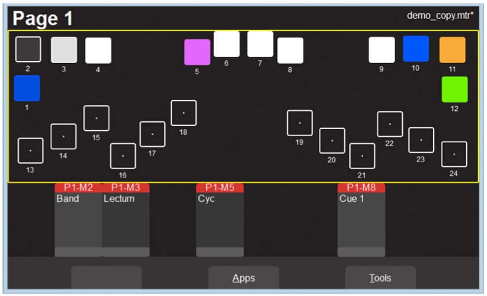Hierzu zählen zunächst die auf den ersten Blick gut erkennbaren klassischen Elemente in Form von Fadern und Buttons, die in gewohntem LSC-Design ausgeführt sind. Insgesamt verfügt die Mantra Lite Konsole über 24 Fixture-Fader und -Buttons, zehn Playback-Fader mit jeweils einem dazugehörigen Flash-Button und letztendlich über zwei Masterfader, die jeweils für die beiden einzelnen Sektionen verantwortlich sind. Hinzu gesellt sich ein farbiger 5-Point-Multitouch-Bildschirm im unteren rechten Abschnitt des Arbeitsbereichs.