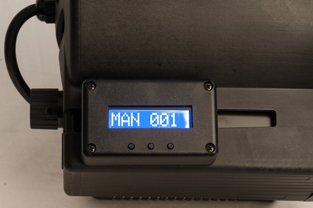 Beim Dayled 1000 hat man sich auf das Wesentliche beschränkt, wodurch der Einsatz absolut unkompliziert und schnell vonstatten geht. Man bedient das Gerät mittels dreier Taster – eine Beschriftung wäre hier wirklich wünschenswert gewesen. Die rechte Taste schaltet zwischen manuellem und DMX-Betrieb um, während die linken Tasten im manuellen Betrieb die Helligkeit zwischen 100 % und 0 % regeln – im DMX-Betrieb wird damit die Adresse eingestellt. Mehr Funktionen bietet der Dayled 1000 nicht – keine Strobefunktion, keine Lüfter-Modi, keine Halogensimulation und auch das Display leuchtet immer und kann nicht deaktiviert werden. Diese Funktionen sind ebenfalls in seinem natürlichen Habitat „Studiobetrieb“ nicht vonnöten. Wichtig für den Betrieb ist aber, dass die Farbtemperatur beim Dimmen absolut stabil bleibt.