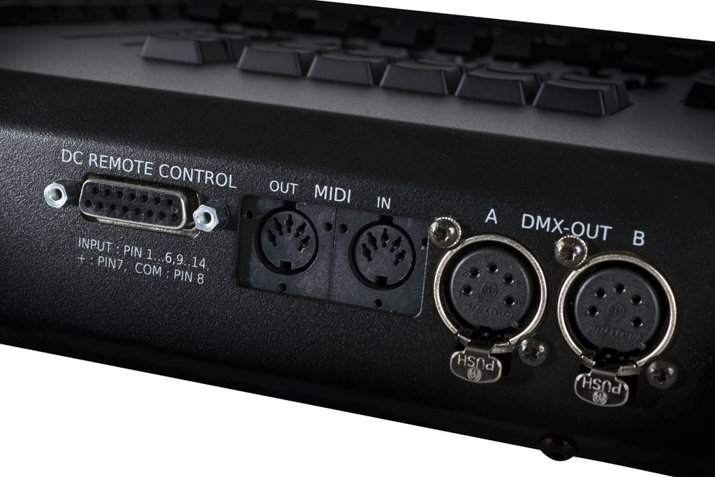 So könnte beim Seitenumschalten auch immer vom aktuellen Intensitätsstand gleich weiter gearbeitet werden. Auch entspricht die Anordnung von sechs Fadern nicht der 5er Block-Darstellung der großen grandMA. Hier kann man zugute halten, dass man den 6. Fader abgesetzt für Geschwindigkeitssteuerung oder Zuschauerlicht ein wenig separieren kann. Auf der anderen Seite hätte man den Platz für den sechsten Fader auch nutzen können, um einen Umschalter der drei 5er Faderblöcke zu realisieren.