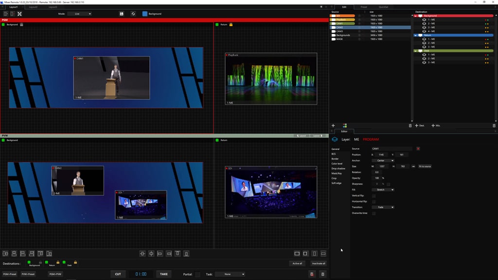 Als weiteres, innovatives Tool können die Eingänge im „Live Mixer“, eine zusätzliche grafische Oberfläche mit einigen Parallelen zu bekannten Datenmischern, bearbeitet werden. Mit Preview-und Programmfenstern kann an einem Extra-Arbeitsplatz ein Bildmischer seine Aufgabe im gleichen System erfüllen. Dadurch verringert sich der Verkabelungsaufwand massiv und eine komplette Video-und Datenregie ist mit einem Gerät sofort einsetzbar. Dadurch sind Fehlerquellen durch externe Verkabelung ausgeschlossen. Als i-Tüpfelchen wünscht man sich nur noch eine Hardware-Konsole, über die man den Live Mixer bedienen kann.