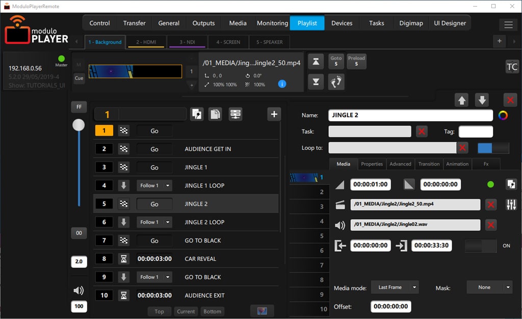 Die GUI ist – einem Wizard ähnlich – mit Tabs in der richtigen Reihenfolge aufgebaut, so dass man durch die grundlegenden Schritte geführt wird. Sind alle Basis-Einstellungen abgearbeitet, landet man im Tab „Playlist“, in dem die eigentliche Show erstellt wird. In den darauffolgenden Tabs wird das Abrufen der Tasks definiert. Das Timeline-basierte Arbeiten ist dem Modulo Kinetic vorbehalten.