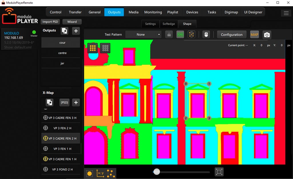 Die wirklich packenden, neuen Features sind das Warpingtool, die NDI-Einbindung und der Live Mixer. Das Warpingtool, X-Map genannt, besticht auch hier durch seine Einfachheit. Mit einem Foto als Vorlage können markante Flächen in Photoshop auf verschiedene Layer gelegt werden. Nach dem Import in den Modulo Player im psd-Format können diese einzeln auf die Flächen der Projektion gelegt werden. Daraus errechnet der Player das komplette Warping – so ist man in sehr kurzer Zeit bei einem perfekten Ergebnis angelangt. Im Detail ist das natürlich trotz allem noch viel Arbeit, diese kann aber an einem separaten Rechner auch von ungeübten Programmierern durchgeführt werden, während auf einer anderen Instanz schon weitergearbeitet wird.