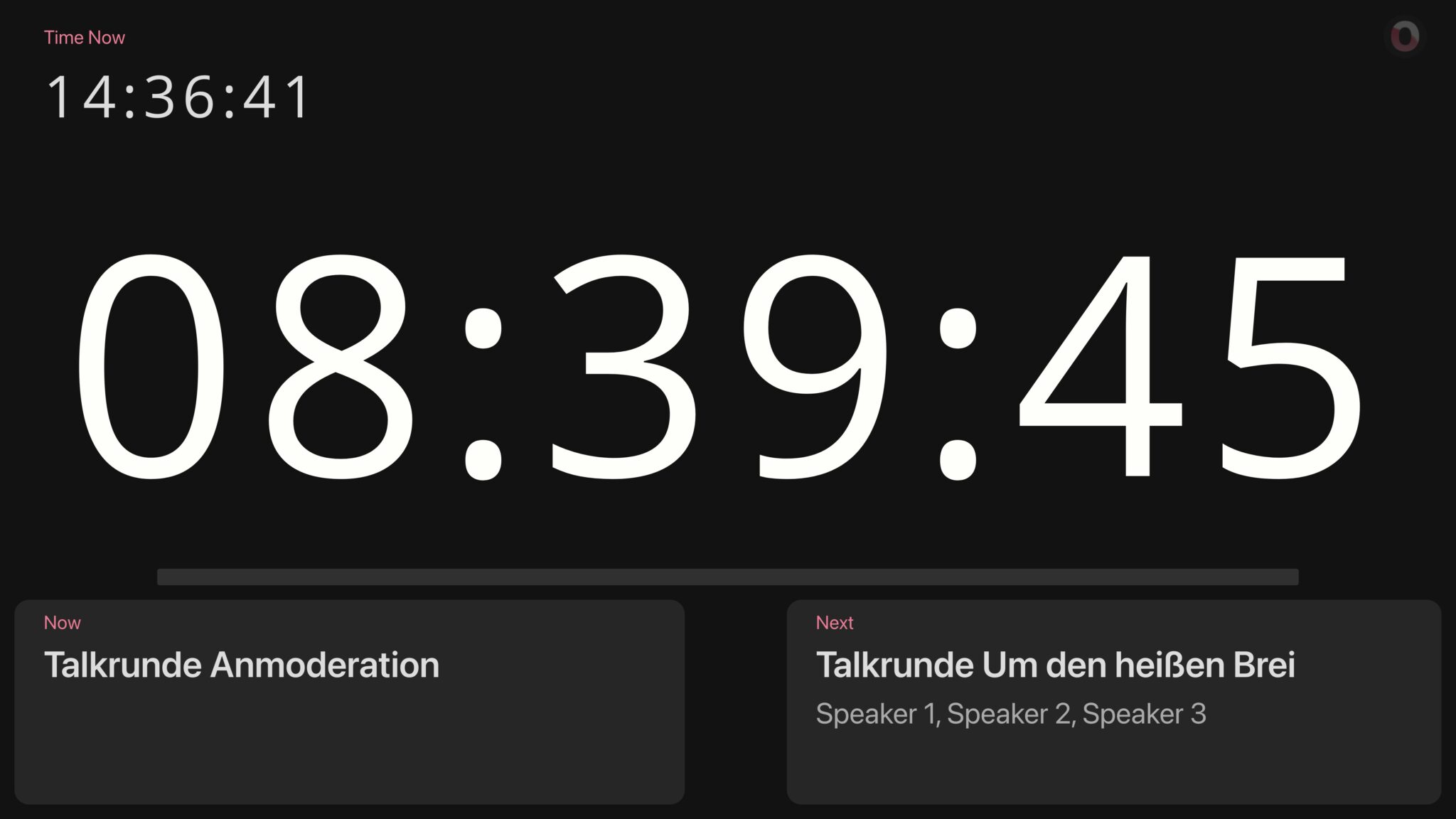 Die Ansicht für Vorschaubildschirme an Bühnen ist die Standardansicht unter https://MEINE.IP.ADRESSE:4001/. Sie ist auch unter /timer, /speaker oder /presenter zu erreichen. Auch hier lässt sich über die URL eine Bearbeitung vornehmen, jedoch nur über die Richtung, in der der Balken läuft, der die verstrichene Zeit repräsentiert. Dieses Thema war unter Test-Nutzern der Software derart 50/50 umstritten, dass eine eigene Funktion dafür ge schaffen wurde. /?progress=down bzw. /?progress=down entscheiden über die Richtung des Zeitbalkens. Darüber hinaus wird der laufende Programmpunkt, der folgenden Programmpunkt und die aktuelle Uhrzeit ausgegeben. Die Ansicht hilft also nicht nur, in der Zeit zu bleiben, sondern auch bei Moderation und allgemeinem Überblick.