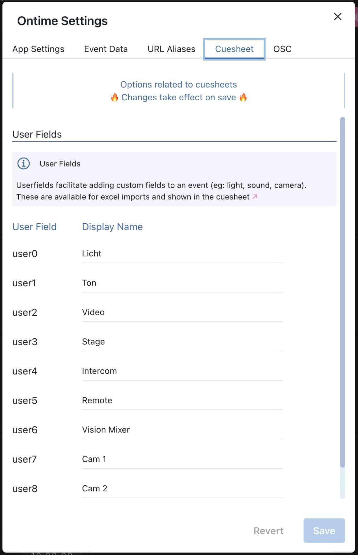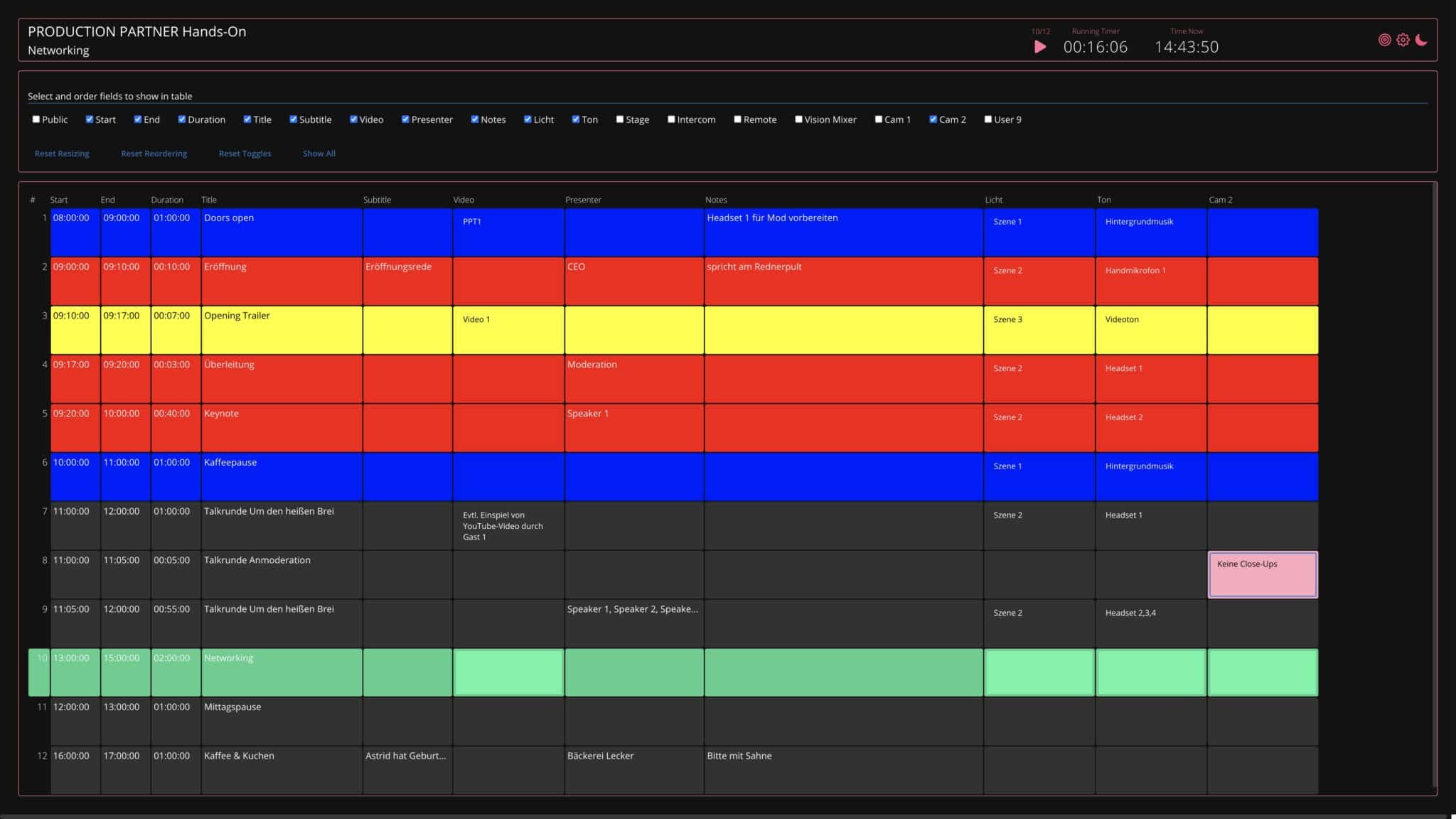 Die wohl mächtigste Ansicht von Ontime ist das Cuesheet, zu erreichen unter https://MEINE.IP.ADRESSE:4001/cuesheet. Diese Ansicht ist in der Lage Ablaufpläne zu ersetzen, denn neben den Standardfeldern aus der Eventliste können zehn weitere „User“ hinzugefügt werden, die dann als Spalten im Ablauf sichtbar sind. Der Inhalt dieser UserSpalten kann im Browser bearbeitet werden. Die Optionen auf der Webseite erlauben das Ein und Ausblenden und eine Neusortierung der Spalten. Die einzelnen Gewerke können ihre Notizen also im Browser und somit direkt auf dem Server hinterlegen und die Ansicht für die eigenen Aufgaben optimieren. Der aktuelle Programmpunkt wird im Browser markiert und alle wissen zu jeder Zeit, wo man sich im Ablauf befindet. Das ist nicht nur beim Event, sondern insbesondere bei Proben, bei denen man schon mal zackig durch den Regieplan springt, von großem Vorteil. Wenn sich Pläne ändern, dann nur an einem Ort und die Notizen bleiben erhalten. Die Ansicht erinnert an Shoflo – eine Software, die Ontime u. a. inspiriert hat. Im Moment fehlt noch die Option, Bilder in Spalten abzulegen, aber bei Open Source steht es allen Bedienenden frei, entsprechende Feature Requests in GitHub zu verfassen.