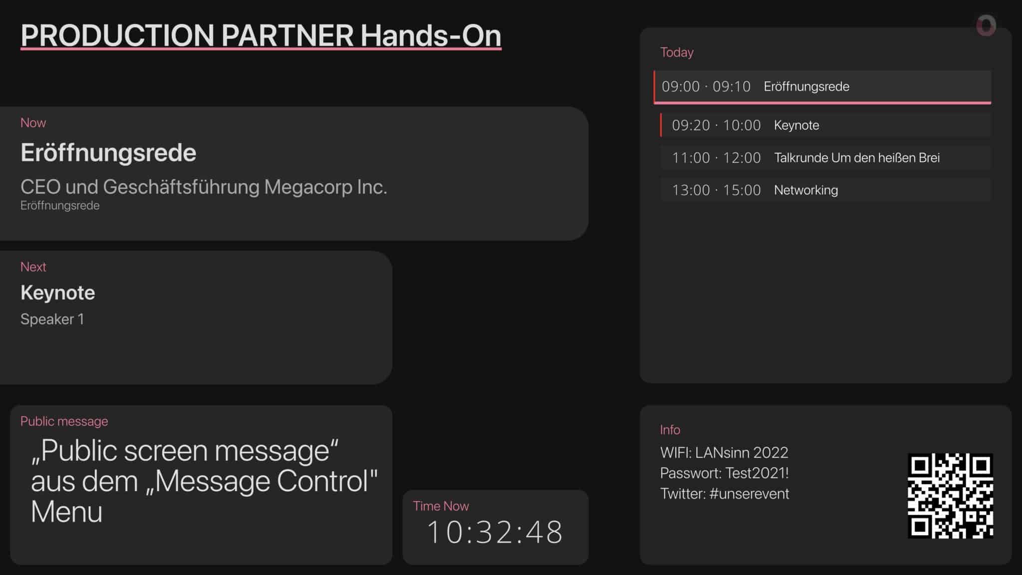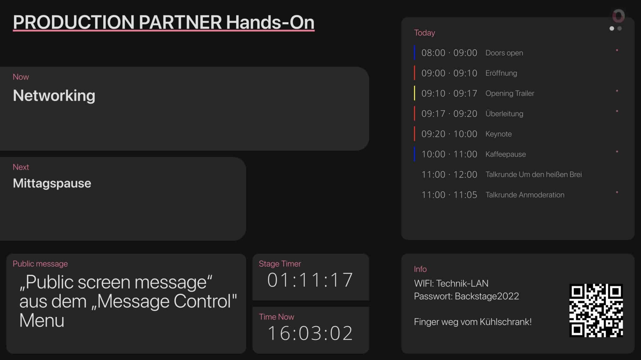 Unter https://MEINE.IP.ADRESSE:4001/sm öffnet sich die Backstage-Ansicht. Hier werden alle Elemente der Eventliste – also egal ob „public“ oder nicht – dargestellt. Eingabefelder in den Optionen sind die Grundlage für das backstagespezifische Infofenster in der Ecke unten rechts. Dies kann man für allgemeine Informationen, wie das Produktions-WLAN oder ähnliche dauerhafte Meldungen nutzen. Der QR-Code richtet sich nach der „EventURL“ die man in den Optionen festlegen kann und ist nicht individuell für Backstage wählbar. Die aktuelle Zeit, der Status des Timers, laufender und folgender Programmpunkt sind in dieser Ansicht natürlich mit von der Partie.