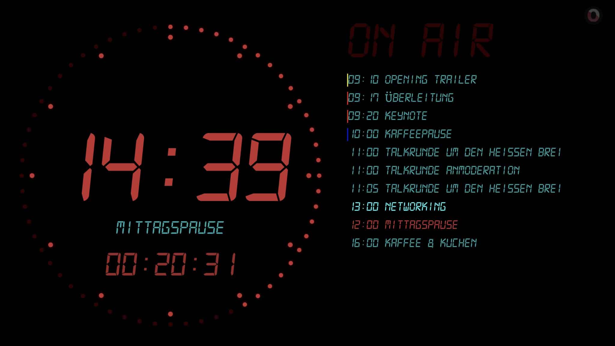 Abgesehen von einer kleinen Schwäche bei Umlauten sieht die Studio Clock besonders schick und offiziell aus. Alle Events werden aufgelistet und das „ON AIR“Zeichen ist integriert. Dieses kann über das UserInterface, per OSC oder mittels der HTTP-API an- oder ausgeschaltet werden. Diese Ansicht ist ideal, um vor den Eingangstüren zu Studios oder Szenenflächen abgebildet zu werden. Erreichbar ist die Studio Clock unter https://MEINE.IP.ADRESSE:4001/studio.