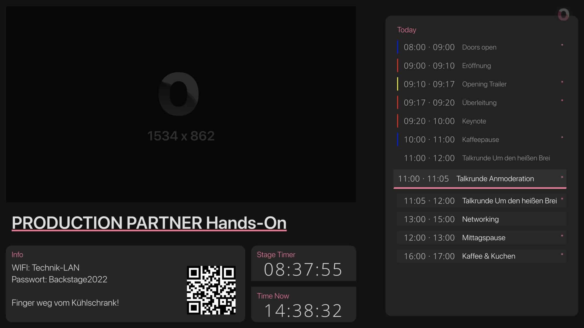 Manche Einsatzgebiete von Ontime liegen auf der Hand: den Ablauf eines Corporate Event damit zu steuern, die Acts und Abläufe eines Festivals oder Konzertabends zu lenken oder die Buchungen und Programmpunkte eines Streaming- Studios zu koordinieren – all das kommt einen schnell in den Sinn. Die Einsatzgebiete müssen da aber nicht enden. Auch für Theater kann Ontime eine große Bereicherung sein. Die Steuerung per OSC kann das Lichtpult zum Taktgeber eines Stückes werden lassen und von Ton-Assistenz bis hin zum Followspot sind alle Positionen auf der gleichen Position im Ablauf, mit den eigenen Notizen. Auch bevor eine Show auf die Bühne kommt, kann das Tool schon eine Rolle spielen. Aufbauten komplexer Events lassen sich damit besser überblicken und koordinieren. Der Bildschirm am Ladetor kann die Ankunftszeiten von Lieferanten zeigen und wann die Fahrt des Riggs vorgesehen ist, kann so auch leicht an ein ganzes Team kommuniziert werden. Nutzt man Tools wie beispielsweise Vingester, können die URLs auch direkt in den Signalfluss von bestehenden AV- System integriert werden und Bauchbinden und Bühnentimer kommen direkt per NDI in die Signalkette.