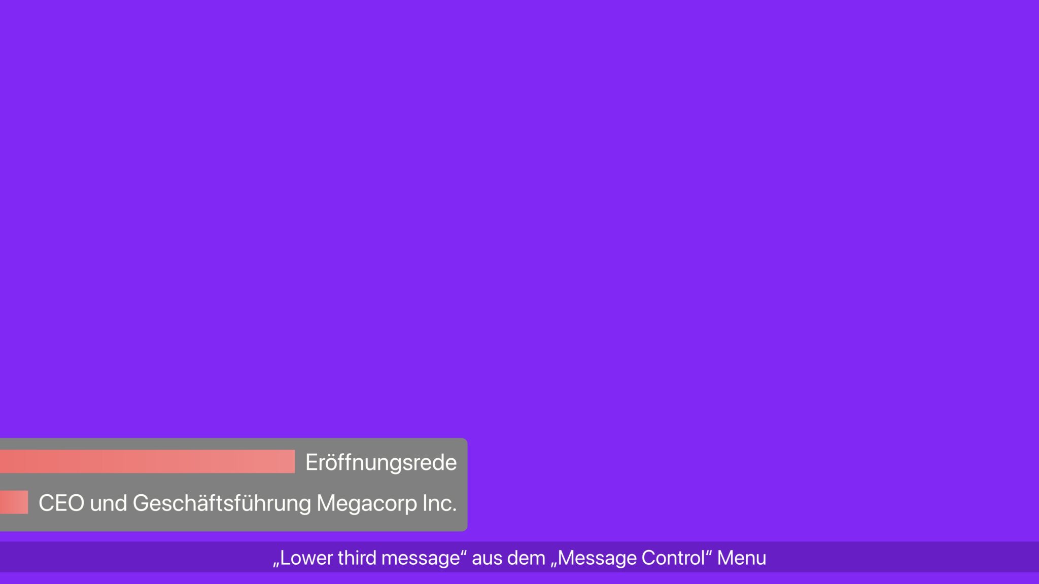 Ontime setzt aus dem Titel eines Programmpunktes und dem Presenter eine Bauchbinde zusammen. Diese wird dann, wie bei allen anderen Darstellungsvarianten, über eine dedizierte Webadresse ausgegeben. Die Bauchbinde wird sogar animiert und mit einzelnen Parametern, die man der URL hinzufügen kann, lassen sich u. a. Farben und Animationszeiten ändern. Hat man mit den – zugegeben etwas umständlichen – URL-Subdirectories eine passende Animation programmiert, so kann diese eher kryptische URL in den Optionen mit einem einfachen Alias ersetzt und so eine bessere Übersicht gewährleistet werden.
